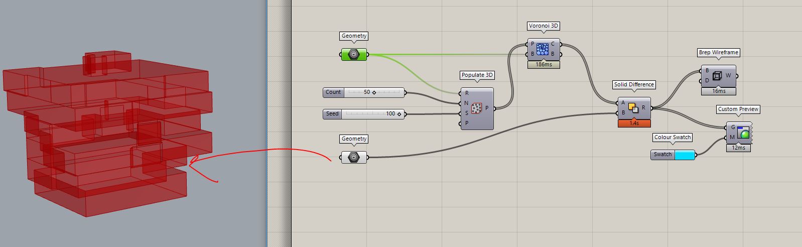 What I’m basically trying to do is to recreate a 3D Voronoi on a geometry to after pipe the voronoi frame in order to obtain a sort of 3dimensional version of it. I managed to do everything with a box but I can’t complete the same operation with a pre- established geometry. From an old discussion in the forum (2013) I found a definition (photo attached) that seems to appear exactly what I want in Rhino but apparently just doesn’t work for me. Hope someone of you can help me with this issue. Thank you in advance.