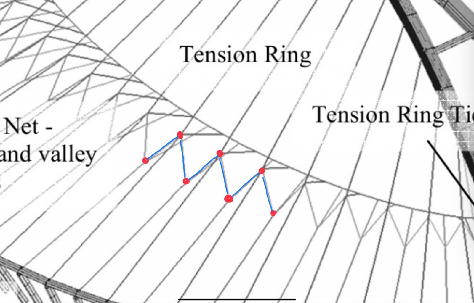 maybe someone can help me here again. it’s about the same design. the two main arches of the stadium that span over the stadium roof should serve as a connection point for the cables. exactly at this connection point are also connected rhods which in turn connect the two main arches with each other. these connections should only be made above the roof opening of the stadium, i.e. in the middle of the arches which make up about 1/3 of the total arch length. after modeling the stadium like this in grashopper, i transferred these lines to rfem via the rfem interface. however, rfem does not calculate the model for me because the connection points for cables and rods are not on the main arches. if you zoom in closely in rhino (see screenshot), you can also see that the points are slightly next to the arch. i have not yet been able to find out why this is the case and i have not found a solution to create this connection point differently so that its lying on the arch. the divide curve command does not seem to work here in any case. does anyone have any ideas on how i can proceed here?