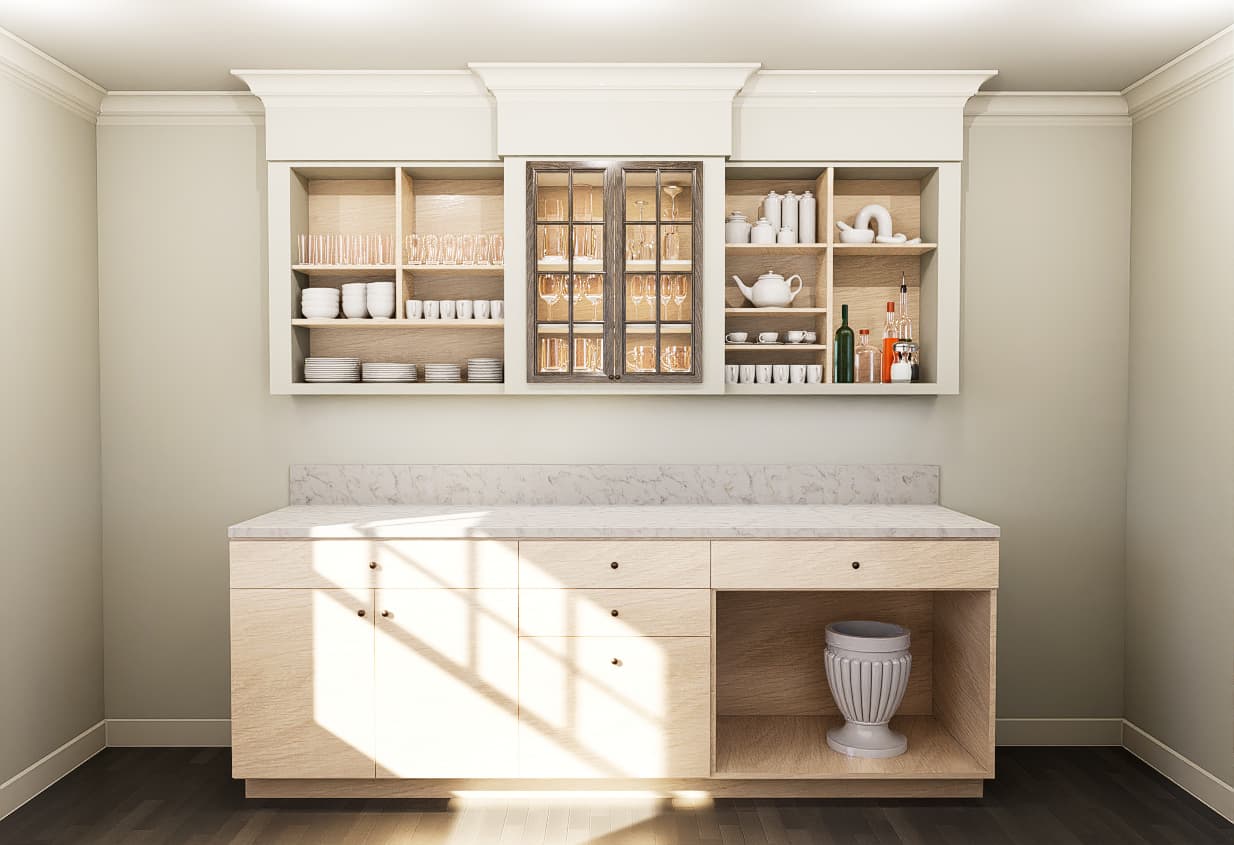 The (clear) glass looks terrible in these first two renders. I started to play around with it but the AI enhancer is what really fixed it. I’m also playing around with the lighting inside the glass door cabinet (practice for an actual real paid job