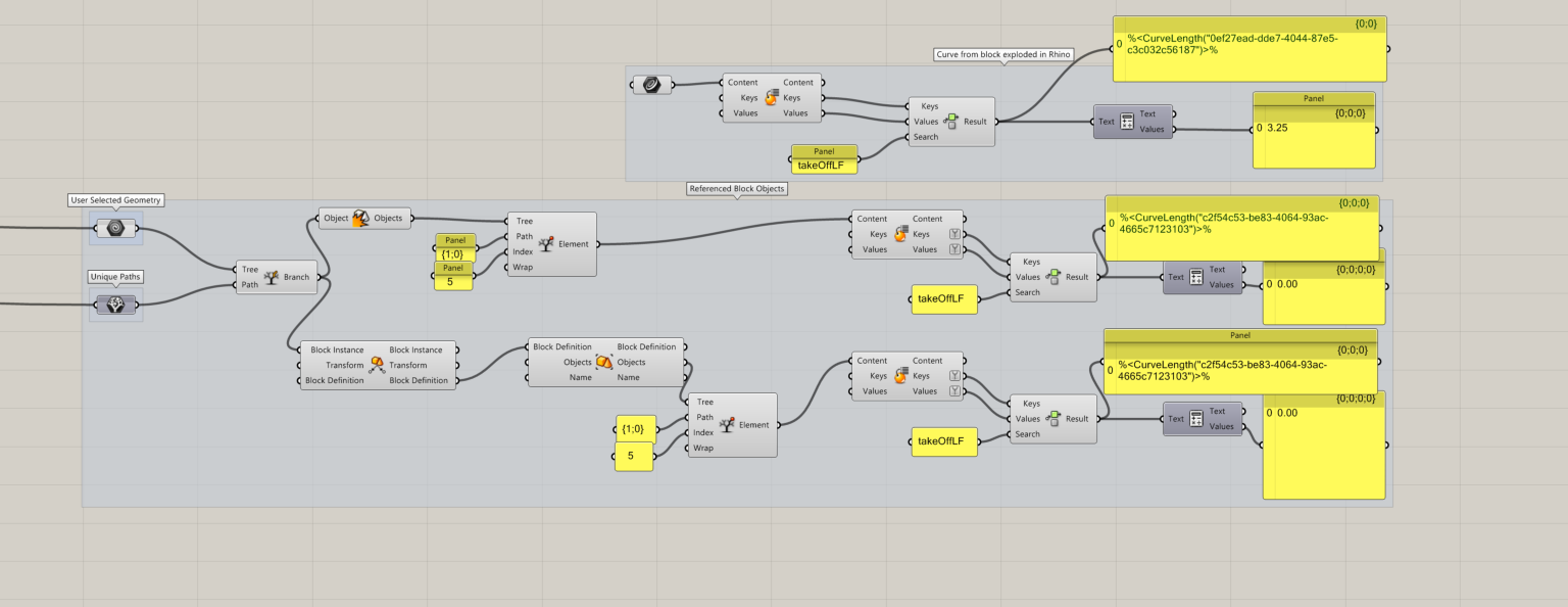 The new evaluate field component appears to work with geometry that is outside of a block but does not work when a block is referenced and then the geometry inside that block is accessed. See below. The top script references the curve after the block has been exploded manually. The bottom tries to access geometry within the block either by exploding the block or by access the block definition components. Either way the field returns a 0 value.