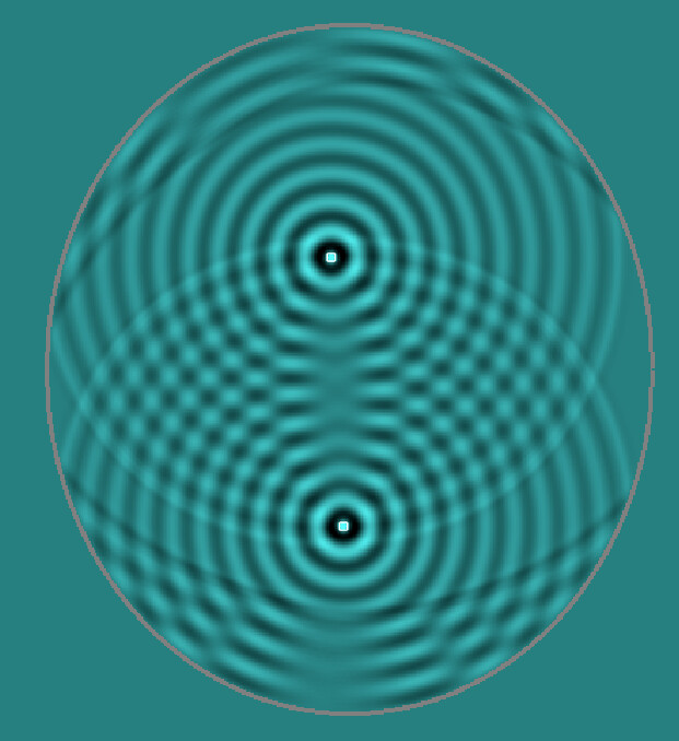 Multiple Sources: As architects, we are especially interested in defining custom container shapes and experimenting with multiple wave sources to see how interference evolves inside these unique geometries as a part of our resonance architecture study.