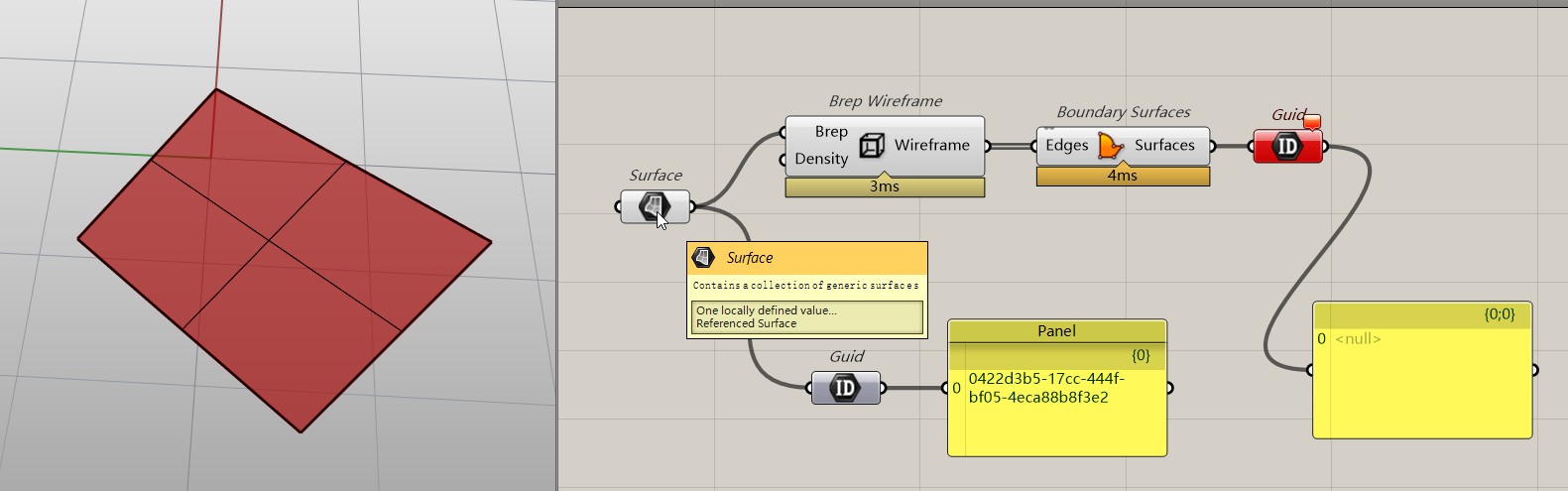 I have included some debug Print statements to produce the output below. Taking as an example the large foreground surface, before opening the GH document, Rhino shows that its GUID is 1f6c8615-889a-4564-a365-066738691888. The GUID remains in the model, never being deleted by the script.