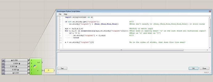 I am not too good when it comes to explaining… But you can google sth. like “sticky python grasshopper”. It’s been answered several times. Sticky generally is a dictionary in which you can save all kinds of things to save state. And triplet is a tuple.