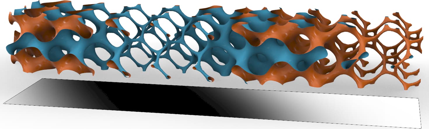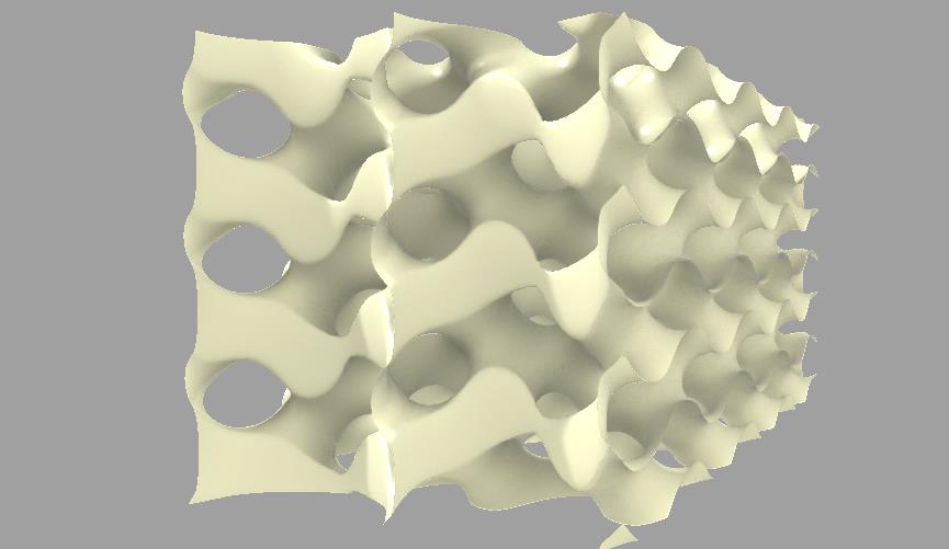 Surfaces are defined by implicit functions as all points with a certain value (level), typically zero. TPMS (triply periodic minimal surfaces) produce values, which fluctuate between positive and negative (like a sine wave).