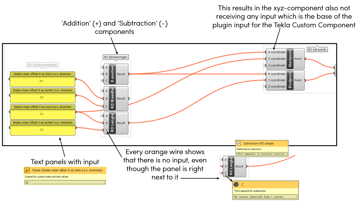 I unfortunately can’t add a .gh file as an example since the problem only seems to occur in larger files (my file) and disappears when the file gets smaller. Also, I have used a lot of Tekla Custom Components, which I can’t share due to privacy reasons. Unfortunately, that means I can’t reliably reproduce the issue in a simplified example. I do hope the image attached shows the problem clearly.