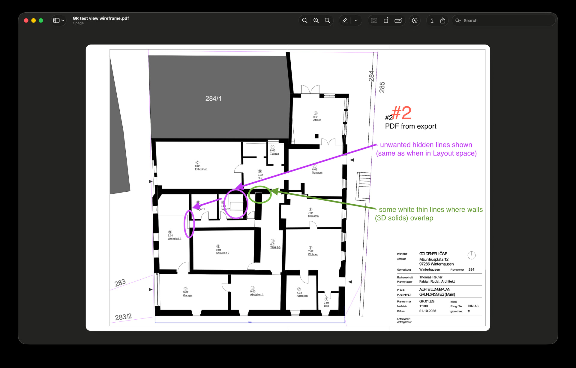 D) The exported PDF: doors (drawn as 2D blocks) missing, thin white lines shown where walls (drawn as 3D solids) overlap. (see “screenshot test 1-d”)