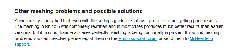 Sometimes, you may find that even with the settings guidelines above, you are still not getting good results. The meshing in Rhino 5 was completely rewritten and in most cases produces much better results than earlier versions, but it may not handle all cases perfectly. Meshing is being continually improved. If you find meshing problems you can’t resolve, please report them on the Rhino support forum or send them to McNeel tech support.