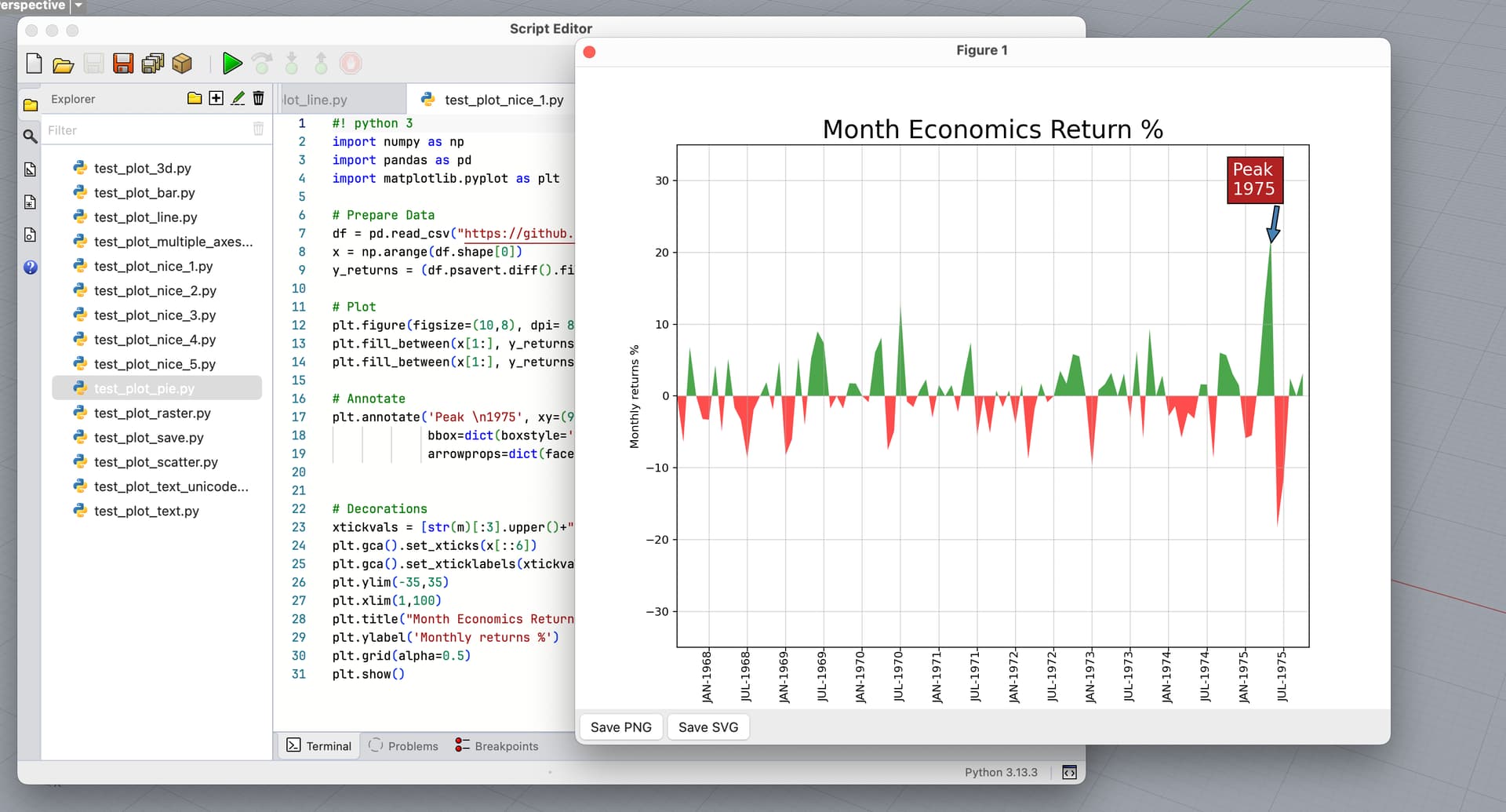 Here is how the plot window looks like. It shows up over the script editor and has buttons to export the plot to .png and .svg formats: