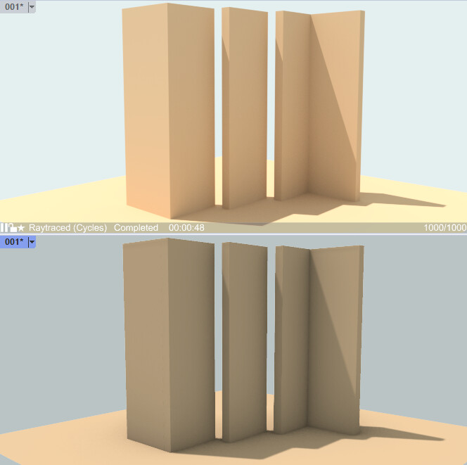 The other issue is: Both in raytracing mode and in rendered mode, the face shade is very faint, especially in contrast with the cast shadow that ends abruptly on the corner. The shaded surface should be closer to the cast shadow, than to the lit surface. In fact in the examples below, it actually looks that the shaded faces are lighter than the lit faces…