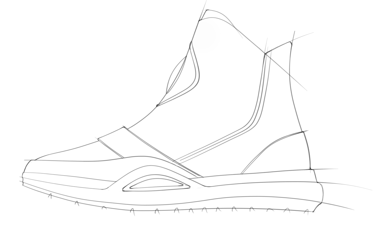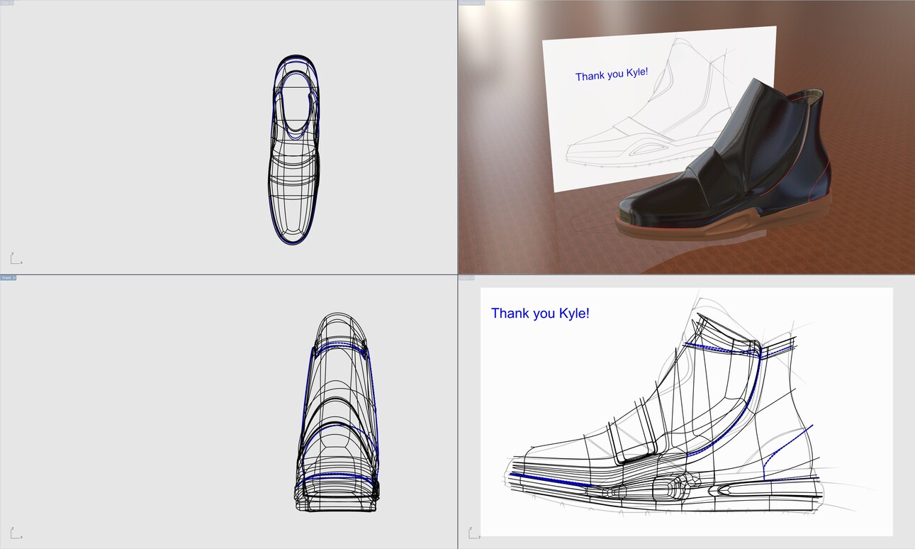 I did not start from a sketch, but from a 3D shoe last scan. I started by drawing some essential curves on the last (SnapToMesh is very helpful while doing that). I missed the option to pull curves to more than one SubD face in one go.