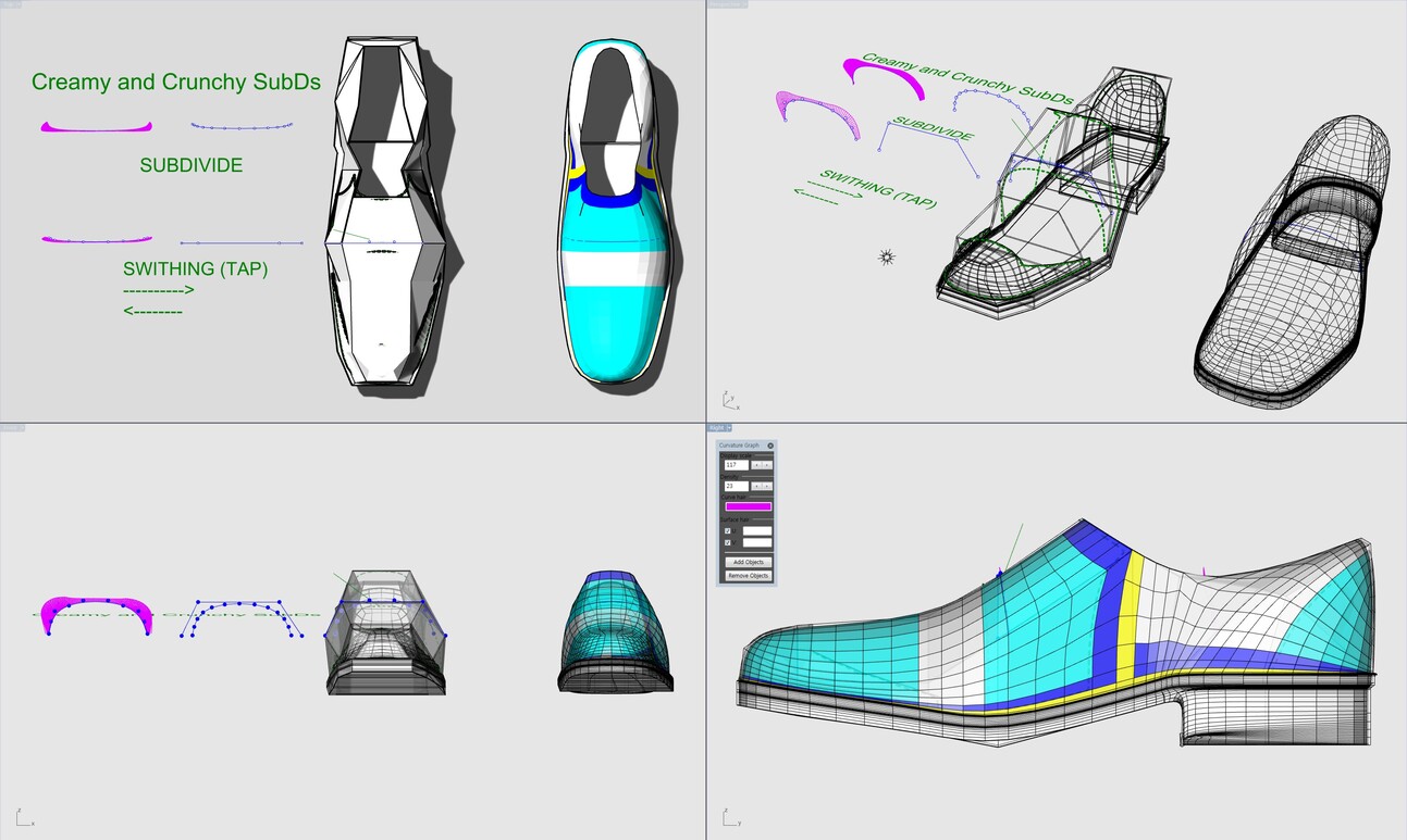 A bit late, but here is my shoe, modeled in SubD (except the eylets).