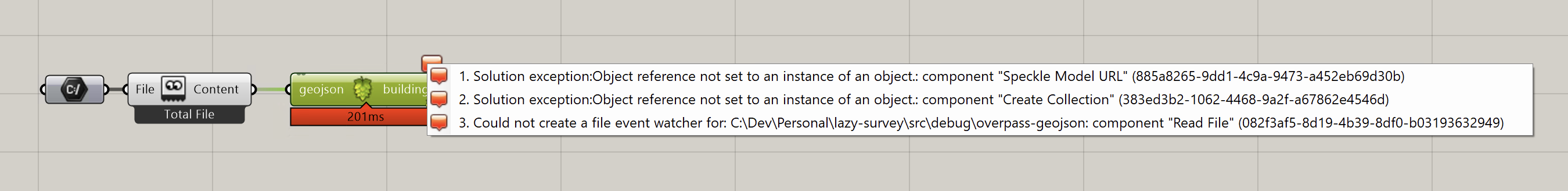 Hi Aidan. This is difficult for me to troubleshoot because I don’t currently have the Speckle plugin installed (but I can try to do this if necessary). But, you also haven’t attached all of the referenced files that I would need in order to test this. I see there are links to the speckle system and also to a geojson file. Can you provide those details as well?