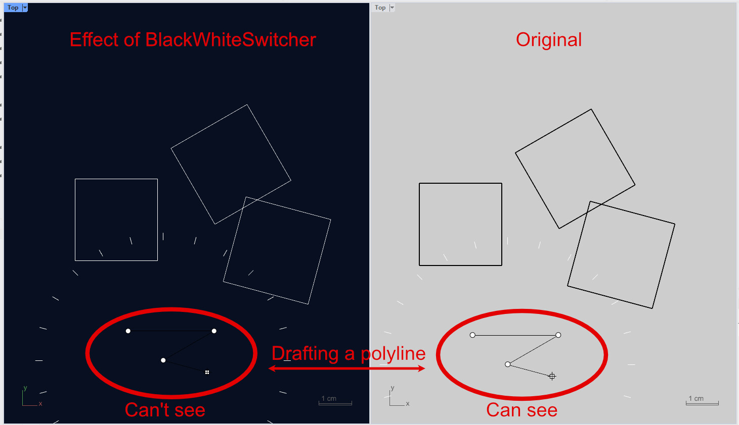Yes, I did. It is working, but only partially. It correctly sets the object’s colour (in this example from black to white). But it is not affecting linework while drafting. On the black background, the colour of the drafted polyline is not converted (it is black) until the process is finished. Only then it turns white. So I can’t properly see what I am drafting until it’s too late